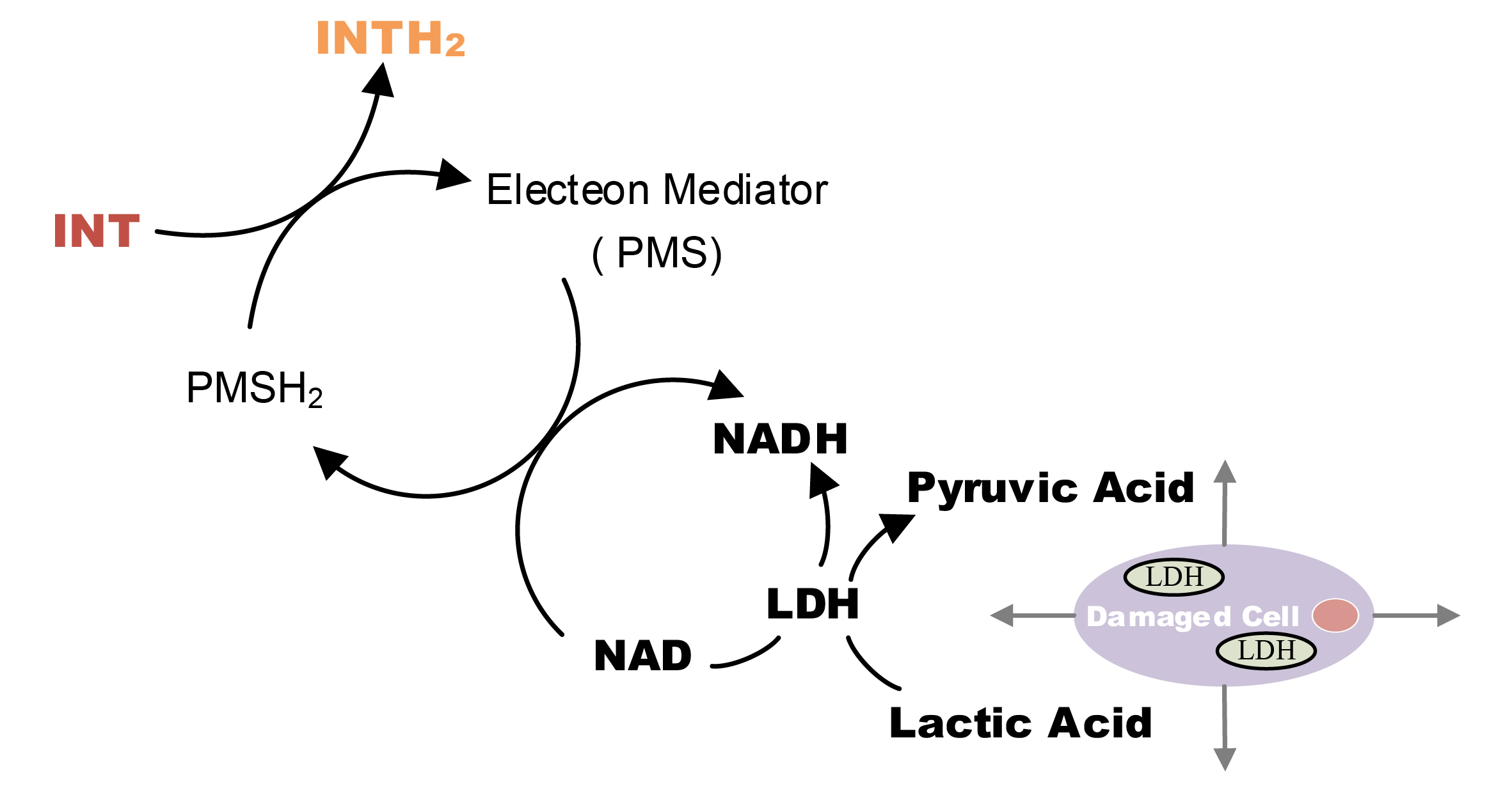 LDH可催化乳酸转化为丙酮酸,同时使氧化型辅酶I(NAD)还原为还原型辅酶I(NADH)。生成的NADH在递氢体吩嗪二甲酯硫酸盐(PMS)的作用下,将碘硝基氯化四氮唑(INT)还原为紫红色甲臜化合物。产物在490 nm处具有特征吸收峰,通过吸光值变化即可表征LDH的活性,通过对LDH活性的定量分析,可间接反映细胞的损伤程度。